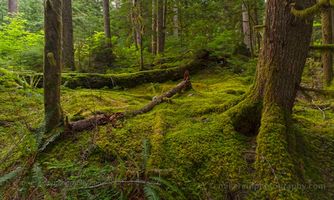 A quiet, moss-covered forest floor glows in soft, filtered light within Mount Rainier National Park. This moody Pacific Northwest woodland scene, captured with the Sony A7R II, reveals layers of green ferns, old-growth trees, and lush textures shaped by mist and rain. A peaceful fine art print evoking the timeless serenity of Rainier’s deep forest wilderness.