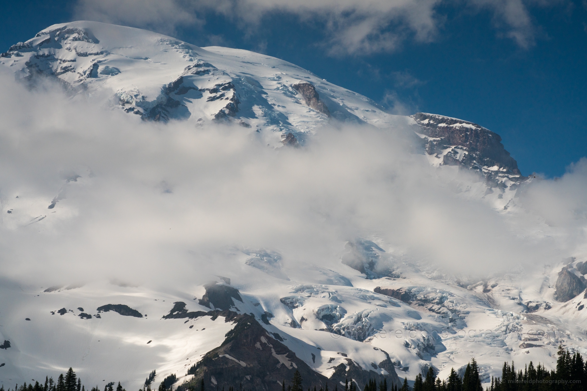 Billowing clouds drift across the icy flanks of Mount Rainier, revealing glimpses of glaciers and rugged volcanic rock beneath. Captured from the Paradise side of Mount Rainier National Park, this fine art landscape photograph showcases the mountain’s immense scale and ever-changing moods as light and mist dance across the snowfields. A dramatic moment of Pacific Northwest beauty and atmosphere.