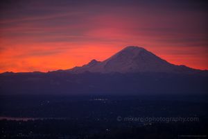 From the top of Seattle’s Columbia Center, dawn ignites the sky above Mount Rainier in radiant hues of crimson and gold. Captured with a Sony A7R2, this fine art photograph reveals the mountain’s majestic silhouette rising above the Cascades under a breathtaking sunrise glow. A striking image that celebrates the harmony between city and wilderness in the Pacific Northwest.