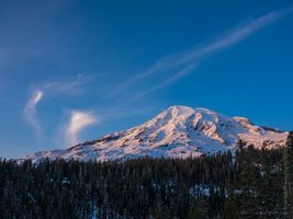 Mount Rainier rises above a forest of evergreens, its slopes glowing under a fresh coat of snow and the soft light of morning. Captured on a clear winter day in Mount Rainier National Park, this serene scene highlights the mountain’s timeless beauty against a deep blue Pacific Northwest sky.