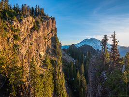 Captured with the Fujifilm GFX 50S medium-format camera, this dramatic view of High Rock Lookout and Mount Rainier glows in golden sunrise light. Sheer cliffs, alpine forests, and the majestic volcano create a quintessential Pacific Northwest landscape rich in texture and depth. A perfect choice for fine-art prints, wall décor, or editorial licensing, showcasing the clarity and tonal range of the GFX system.