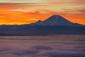A breathtaking sunrise ignites the sky above Mount Rainier, painting the horizon in vivid orange and gold while a sea of clouds drifts below. Captured from the Seattle area, this fine art photograph showcases the mountain’s graceful silhouette rising over the Cascade Range, bathed in early morning light. A serene and powerful expression of the Pacific Northwest’s timeless beauty.