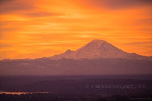 A brilliant orange-gold sunrise bathes Mount Rainier in warm light above the Cascade foothills and the quiet valleys below. The mountain’s snow-covered slopes catch the first color of dawn, while soft haze drifts across the horizon. This fine art photograph captures the timeless beauty of a Pacific Northwest morning — tranquil, radiant, and unforgettable.