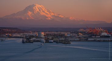 From Brown’s Point in Tacoma, the immense silhouette of Mount Rainier glows in soft evening light, towering above the city’s active waterfront and harbor cranes. The mix of natural grandeur and human industry creates a striking Pacific Northwest panorama — a timeless view where Tacoma meets the mountain under a glowing sunset sky.