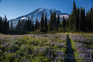 A peaceful trail winds through blooming lupine meadows beneath the towering presence of Mount Rainier. Captured along the Lakes Trail in Mount Rainier National Park, this summer landscape showcases the vivid purples and greens of the alpine wildflower season, illuminated by the crisp morning light of the Pacific Northwest.