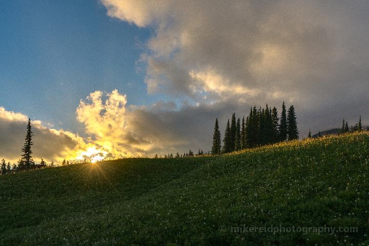 The sun bursts through drifting clouds, casting golden rays across Mount Rainier’s alpine meadows. Captured just before sunset, this peaceful landscape highlights the contrast between warm evening light and the deep greens of the subalpine slopes. A timeless Pacific Northwest mountain scene filled with light, texture, and quiet beauty.