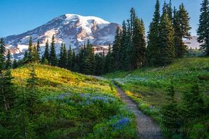 A winding path along the Lakes Trail in Mount Rainier National Park leads through sunlit wildflower meadows toward the glacier-capped peak of Mount Rainier. The scene glows with vibrant lupine, paintbrush, and alpine greens, capturing the serene beauty of a summer morning in the Pacific Northwest wilderness.