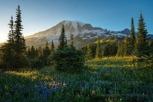 Golden evening light sweeps across the wildflower meadows and evergreens of Mount Rainier National Park. The glacier-capped peak glows softly above the alpine landscape, creating a serene Pacific Northwest scene filled with warmth, depth, and quiet mountain beauty as the day fades.