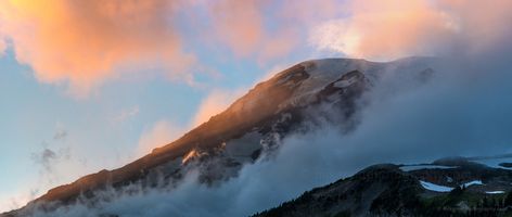 The last light of sunset brushes across the rugged glaciers and slopes of Mount Rainier, glowing in warm orange and pink tones as mist and cloud wrap the mountain’s flanks. Captured from the Paradise side of Mount Rainier National Park, this moment reveals the mountain’s fleeting brilliance before nightfall — a luminous, atmospheric fine-art landscape that embodies the wild beauty of the Pacific Northwest.