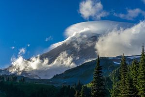 A luminous lenticular cloud drifts across the summit of Mount Rainier, forming a glowing halo in the crisp alpine air above the Skyline Trail. Sunlight breaks through the swirling mist, illuminating the snow-covered slopes and deep green ridges below. This dramatic scene captures the dynamic weather and ethereal beauty of Mount Rainier National Park, a true showcase of the Pacific Northwest’s wild mountain light.