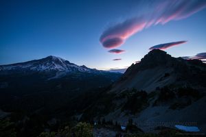 At dawn, a vibrant lenticular vortex cloud glows above Mount Rainier, its edges brushed with the soft pink light of sunrise. The mountain’s icy slopes and rugged ridgelines rise in silhouette beneath the unfolding morning sky. Captured from the Skyline Trail, this rare atmospheric moment reveals the living motion of light, wind, and mountain weather in Mount Rainier National Park.