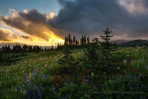 A dramatic sunset glows through storm clouds above the wildflower meadows of Mount Rainier National Park. The golden light breaks through shifting skies, illuminating a vibrant foreground of lupine, paintbrush, and alpine evergreens. Captured at day’s end, this image embodies the untamed beauty and fleeting moods of the Pacific Northwest wilderness.