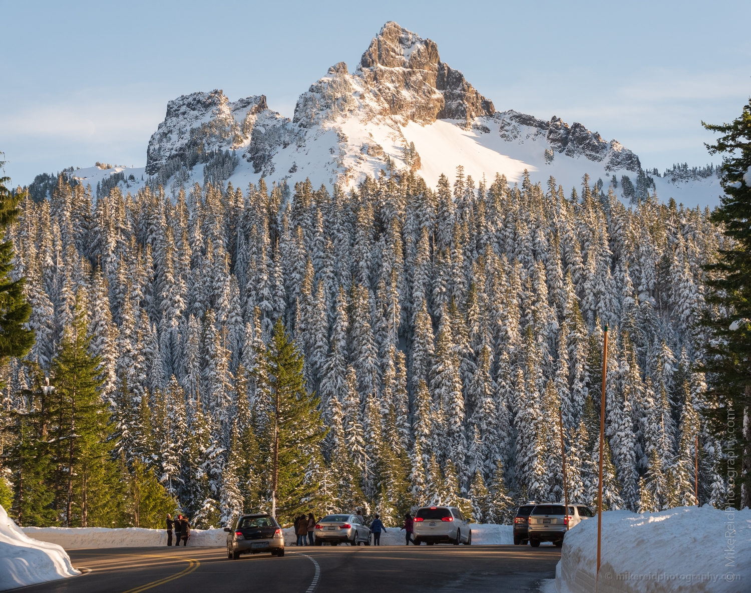Evening light warms the snow-covered evergreens and rugged peaks of the Tatoosh Range, seen from the winding road to Paradise in Mount Rainier National Park. Captured with the Fujifilm GFX100S, this winter landscape reveals the dramatic beauty of the Cascades, where golden light meets alpine serenity. A striking Pacific Northwest winter scene ideal for fine art collectors and mountain lovers alike.