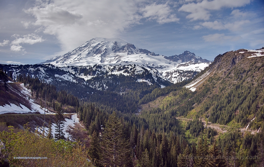 A sweeping view along Stevens Canyon Road reveals Mount Rainier rising above snow-covered ridges and evergreen valleys. Early summer light highlights the winding mountain highway, snow patches, and alpine forests that define this classic drive through Mount Rainier National Park. A timeless fine art landscape celebrating the beauty of Washington’s volcanic peak and the grandeur of the Cascade Range.
