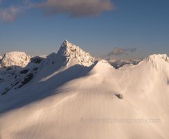 An aerial perspective of Bacon Peak rising majestically above sweeping snowfields in Washington’s North Cascades. The view captures the soft, sculpted ridges leading up toward the jagged summit, where the late-day light casts warm tones over the untouched alpine terrain. Subtle ski tracks trace graceful lines across the slope, hinting at quiet exploration in this remote wilderness. A serene portrait of mountain solitude and the elegance of winter light.