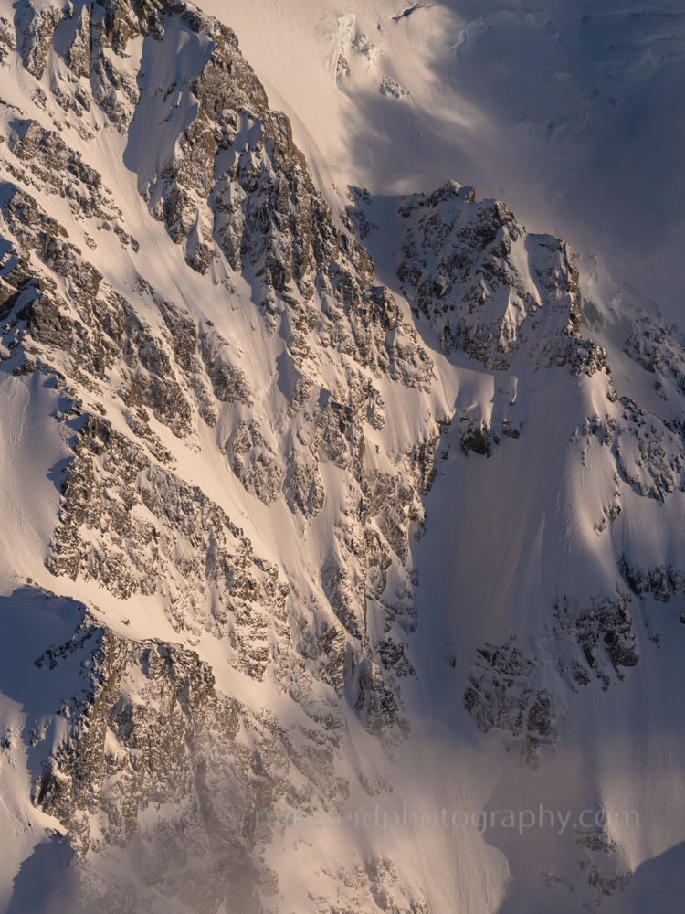A detailed aerial closeup of the rugged Curtis Glacier on Mount Shuksan, Washington. Evening light reveals the intricate interplay between ice, snow, and volcanic rock — a stunning composition of light and texture that captures the glacier’s raw alpine beauty. This fine art mountain photograph showcases the drama of Shuksan’s steep western face, where flowing snowfields meet sharp rock ridges under golden light.