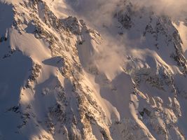 Evening light grazes the fractured ice and steep rock walls of Mount Shuksan’s Curtis Glacier, revealing the intricate texture of snowfields, seracs, and shadowed couloirs. Mist drifts across the cliffs, softening the glacier’s raw drama beneath warm alpenglow. This intimate aerial view captures the interplay of light, form, and frozen movement that defines one of the North Cascades’ most iconic and photogenic faces.
