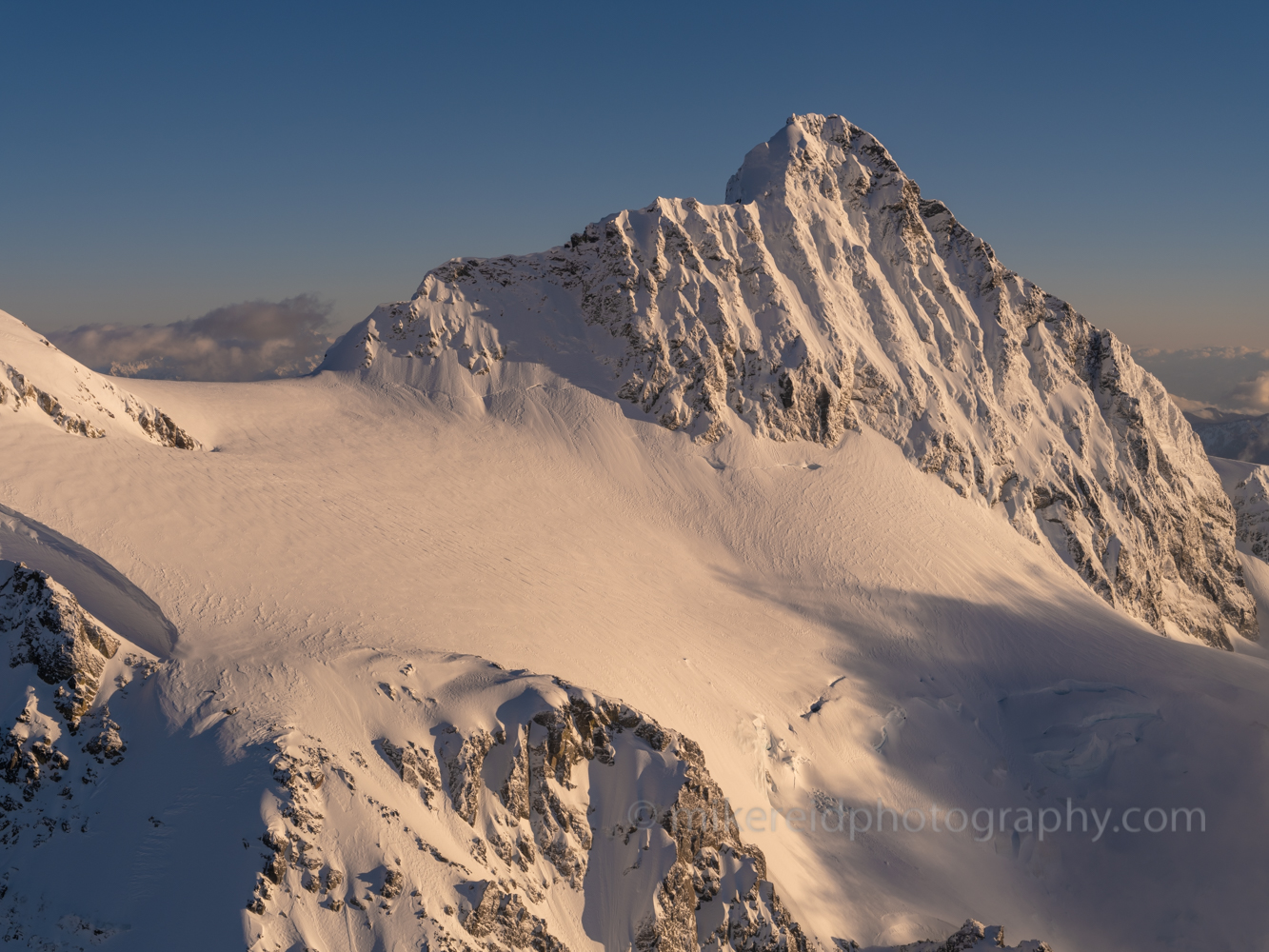 An aerial view of Mount Shuksan’s towering Summit Pyramid rising above the snow-covered expanse of the Upper Curtis Glacier in Washington’s North Cascades. Captured in warm evening light, the glacier’s smooth contours flow toward the base of Shuksan’s rugged cliffs, where shadow and texture define the mountain’s dramatic profile. This fine art photograph highlights the beauty and power of one of the Pacific Northwest’s most iconic alpine peaks.