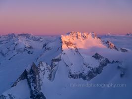 A radiant aerial view of Mount Goode in Washington’s North Cascades, bathed in glowing alpenglow as sunset light spills across its snow-clad ridges and glacier fields. The evening sky fades into soft pinks and purples, reflecting across the icy expanse of this rugged alpine peak. Captured with the Fuji GFX100S, this fine art photograph reveals the grandeur and tranquility of the Pacific Northwest high country at day’s end — a fleeting moment of mountain serenity suspended in light.