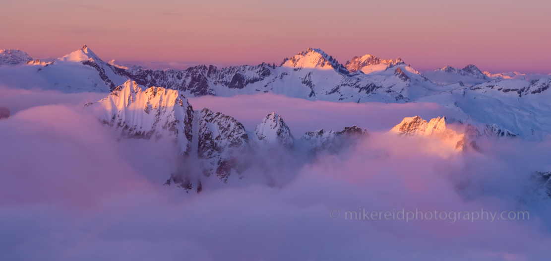 An ethereal aerial view of the North Cascades at dusk, where Mount Formidable, Mount Goode, and neighboring peaks rise through a sea of pastel clouds. The final light of day casts soft pink, lavender, and gold hues across the rugged alpine terrain, revealing the intricate ridges and snowfields of these Washington giants. Captured with the Fuji GFX100S, this fine art aerial photograph embodies the fleeting magic of alpenglow high above North Cascades National Park — a timeless moment where mountain and sky merge in light.