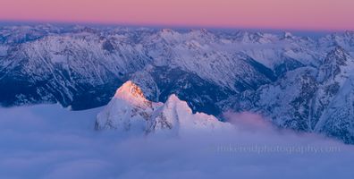 A stunning aerial capture of Eldorado Peak in Washington’s North Cascades, bathed in the warm glow of sunset alpenglow. As the day fades, the snow-clad ridges and ice fields blush with soft pink and gold tones above the deep shadows of the surrounding valleys. This view reveals the delicate balance of light and cold that defines high alpine evenings, as the last rays illuminate one of the range’s most iconic summits. Shot with the Fuji GFX100S, this fine art print embodies the peaceful brilliance of the Pacific Northwest wilderness at day’s end.