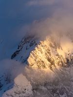 A fleeting moment of golden light breaks through clouds to illuminate a rugged North Cascades peak, where snow, ice, and rock converge in dramatic harmony. Captured from the air, this photograph reveals the intricate textures and steep faces glowing under the last rays of sunlight as mist drifts across the mountain. The interplay of warmth and cold creates a powerful sense of contrast and serenity—an ethereal glimpse of the Pacific Northwest’s alpine beauty.