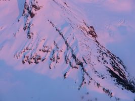 A luminous closeup of Mount Baker’s North Ridge glowing in radiant alpenglow as the last light of sunset grazes its rugged slopes. The intricate ridgelines and snow-covered cliffs catch warm hues of pink and violet, contrasting beautifully with the deep blue shadows of the glacier below. Captured with the Fuji GFX100S, this aerial image reveals the sculptural drama and fleeting warmth of evening light across one of the North Cascades’ most iconic volcanic faces — a fine art celebration of mountain elegance and Pacific Northwest wilderness.