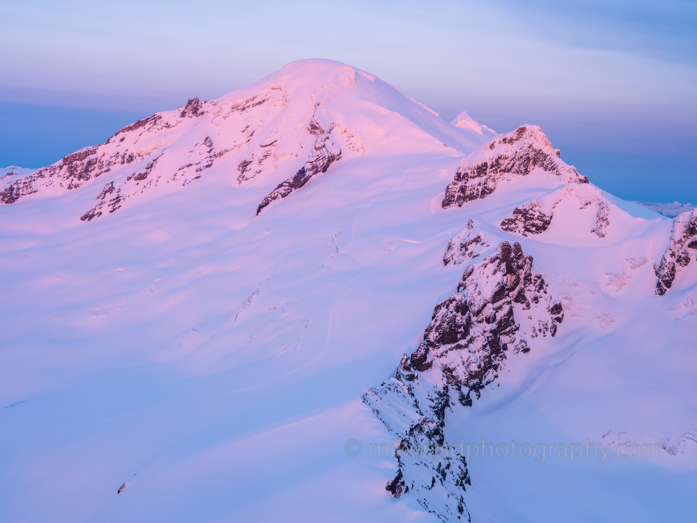 An aerial view of Mount Baker bathed in soft alpenglow reveals the classic Coleman Glacier climbing routes winding past the Black Buttes toward the Roman Wall and summit plateau. The scene captures the delicate pink and lavender tones of sunset reflected across the glacier’s smooth surface and crevassed terrain. This breathtaking perspective, photographed with the Fuji GFX100S, offers a mountaineer’s dream view—tracing the path of one of the most popular and scenic routes to the summit of Washington’s iconic volcanic peak.