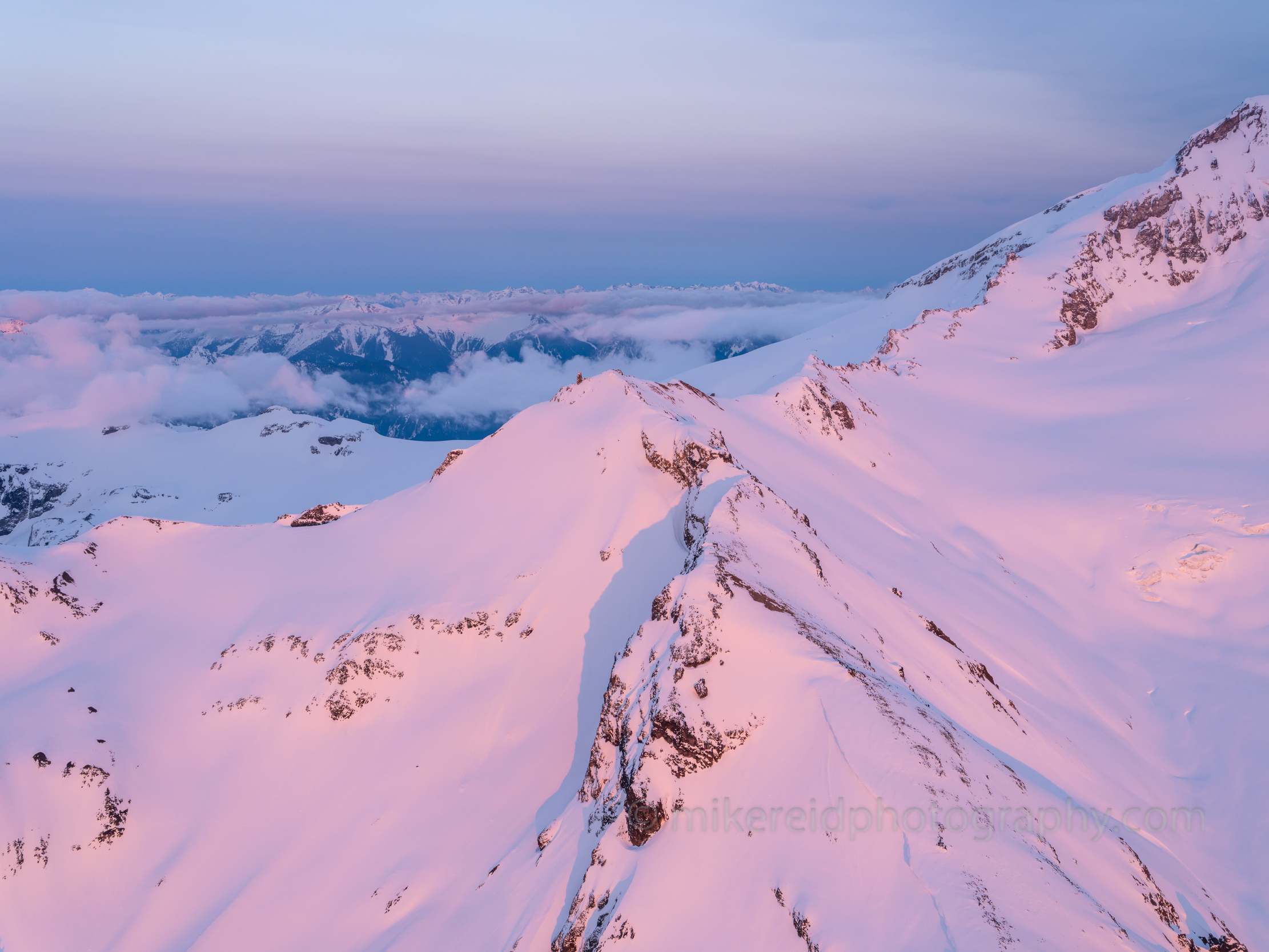 A stunning aerial closeup capturing Hadley Peak and the slopes of Mount Baker bathed in radiant alpenglow light. The soft pink and lavender tones of sunrise sweep across the snowfields, emphasizing the dramatic ridgelines and volcanic contours of the North Cascades. Shot with the Fuji GFX100S, this image reveals the quiet majesty and sculptural grace of Baker’s upper slopes — a timeless fine art aerial from Washington’s high alpine realm.