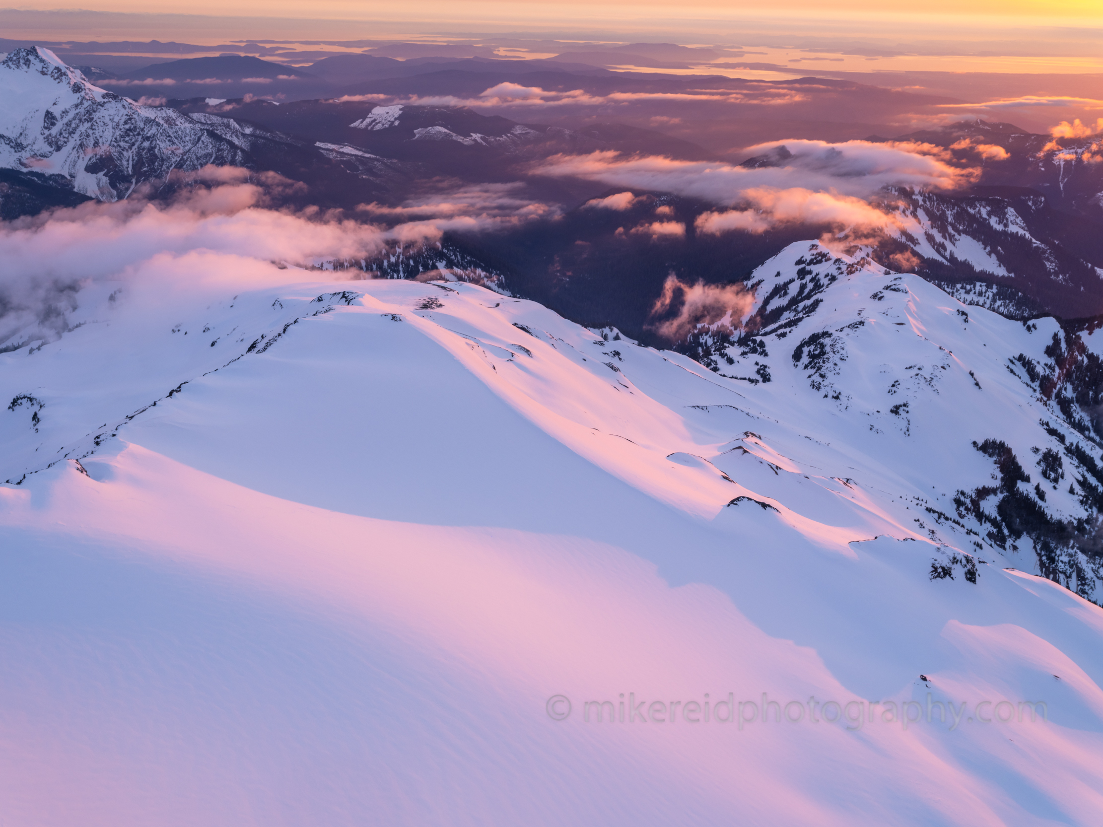 An aerial view of Mount Baker’s snow-covered slopes glowing under a vivid sunset, with the Sisters Peaks rising on the left and the sinuous Coleman Glacier flowing toward Puget Sound in the distance. Captured with the Fuji GFX100S, this photograph blends alpine tranquility with the grandeur of scale — soft alpenglow light illuminating the glacier’s gentle curves, clouds drifting over the Cascade foothills, and the far western horizon fading into the golden Pacific light. A breathtaking portrayal of Washington’s wild beauty from summit to sea.