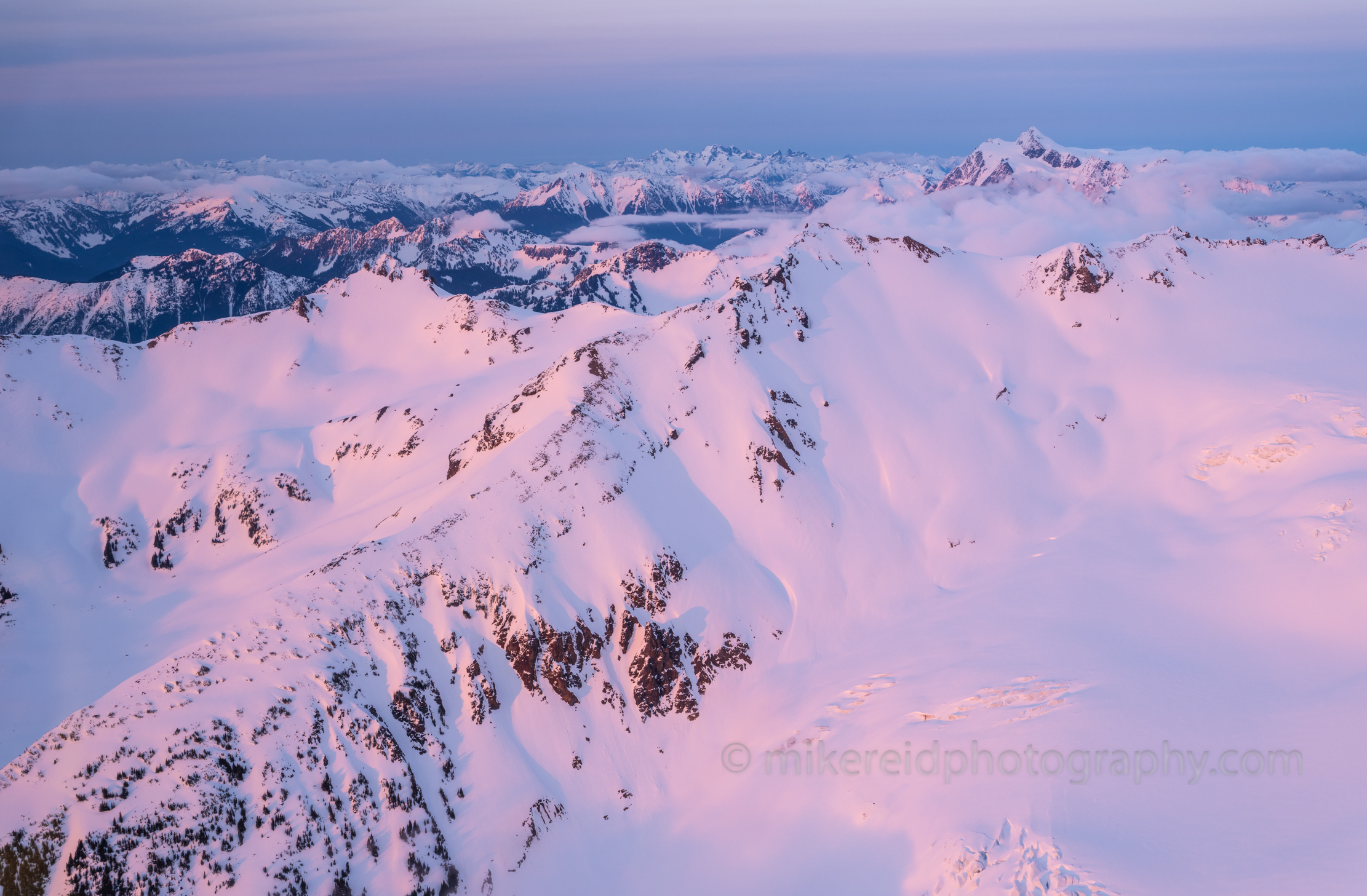 An ethereal aerial panorama sweeping from Hadley Peak to Mount Shuksan, bathed in soft alpenglow light over the North Cascades. The snow-clad ridges roll in waves of rose and violet hues as dawn’s light grazes the summits, illuminating the rugged alpine textures that define this wild region. Captured with the Fuji GFX100S, this image embodies the serenity and vastness of Washington’s high country — a timeless moment suspended between mountain and sky.