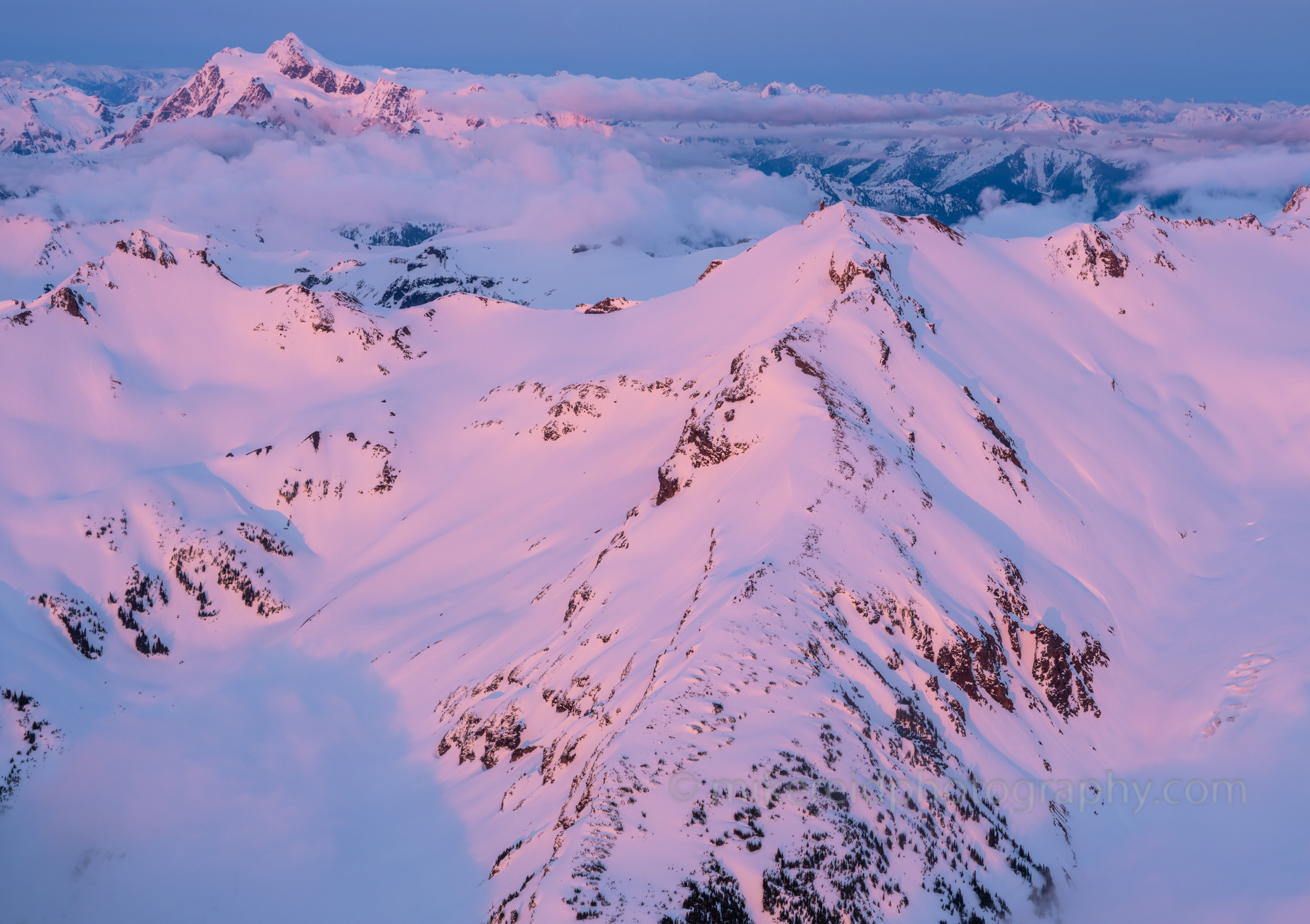 An ethereal aerial view stretches from Hadley Peak toward the majestic slopes of the Portals and Mount Shuksan, bathed in a luminous wash of pink and violet alpenglow. The snow-draped ridgelines and shadowed valleys of the North Cascades glow softly in the fading twilight, revealing the rugged elegance of this iconic alpine terrain. Captured with the Fuji GFX100S, this fine art aerial photograph captures the fleeting transition between day and night—where color, light, and mountain form merge in a moment of quiet perfection.