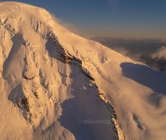 A striking close-up aerial view of Mount Baker glowing in the rich golden light of sunset. The intricate textures of Baker’s glacier-covered slopes and steep volcanic faces are illuminated in warm tones, while shadows accentuate the depth and drama of the mountain’s form. Captured from above the clouds, this fine art photograph reveals the majestic detail and power of one of Washington’s most iconic peaks — a perfect moment of alpenglow over the North Cascades.