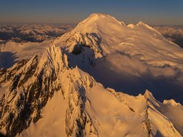 An awe-inspiring aerial view of Mount Baker and Colfax Peak bathed in the golden alpenglow of sunset. The rugged cliffs of Colfax rise sharply from the glaciers below, their ridges glowing with reflected light as shadows drift across Baker’s broad snow dome. This image captures the grandeur and serenity of Washington’s North Cascades, where volcanic majesty meets evening light in a moment of pure alpine calm. Perfect for lovers of mountain photography and the Pacific Northwest’s wild beauty.