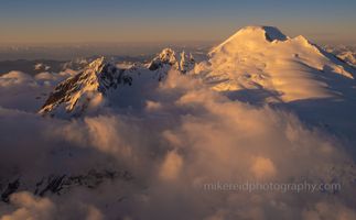 A breathtaking aerial view of Mount Baker, Colfax Peak, and the rugged Black Buttes glowing in the warm alpenglow of sunset. The soft golden light brushes across Baker’s sweeping snowfields, revealing delicate textures in the glacier-covered slopes. Colfax Peak and the Black Buttes rise dramatically in the foreground, their rocky summits piercing through a sea of illuminated clouds. This fine art image captures the grandeur and tranquility of the North Cascades — where volcanic ice and alpine rock meet under a glowing Pacific Northwest sky.