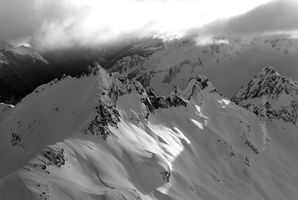 An aerial black and white photograph captures the dramatic spine of Mount Buckindy and the surrounding North Cascades peaks under shifting light and cloud. The ridgeline’s sharp contours cut through swirling mist as sunlight breaks through, illuminating the snowfields and shadowed valleys below. The tonal contrast emphasizes the rugged geometry and quiet solitude of the range—an evocative study of mountain form and winter light. Captured with the Fuji GFX100S, this fine art monochrome image reveals the timeless majesty of Washington’s alpine wilderness.