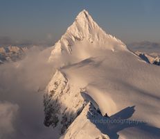 An aerial view of the northwest face of Mount Shuksan’s Summit Pyramid, illuminated by the last warm light of day. Below the peak, the upper Curtis Glacier sweeps gracefully toward the valley, its smooth snowfield contrasting with the jagged ridges above. Captured from the air over the North Cascades, this image highlights the grandeur, texture, and symmetry of one of Washington’s most recognizable alpine summits.