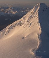 High on Mount Shuksan’s Summit Pyramid, a faint climbers’ trail winds upward through wind-sculpted snow toward the sharp, glowing summit. Bathed in soft evening light, the snow ridge reveals elegant textures and delicate shadows that trace the route to one of the North Cascades’ most iconic peaks. This aerial photograph captures the scale, solitude, and serenity of alpine ascent — a timeless moment of mountaineering grace framed in golden light.