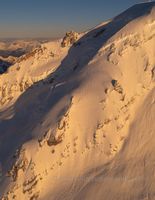 An awe-inspiring aerial close-up of Mount Baker’s formidable north face bathed in warm sunset light. The scene captures the mountain’s immense glaciers, sheer ice cliffs, and deep textures glowing gold against the encroaching alpine shadow. This fine art photograph reveals both the raw power and sculpted grace of Baker’s northern slopes, a breathtaking tribute to the rugged beauty of the North Cascades in evening light.