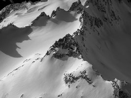 A striking black and white aerial image of the Dana Glacier flowing beneath Dome Peak in Washington’s North Cascades. Without color, the drama of form and texture takes center stage — sweeping snowfields, serrated ridgelines, and deep shadows carve an abstract study of light and mountain geometry. This fine art monochrome photograph reveals the timeless power and elegance of the North Cascades wilderness, transforming ice and rock into a sculptural landscape of pure contrast and tone.
