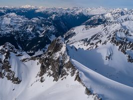 A breathtaking aerial view of the rugged ridge between Snowking Mountain and Mount Chaval in Washington’s North Cascades. Captured in winter, the scene reveals the jagged rock spires, steep snowfields, and deep alpine valleys that define this remote wilderness east of Darrington. The soft daylight enhances the textures of the cliffs and glaciers, highlighting the wild beauty of the Snowking–Chaval massif — a dramatic intersection of stone, snow, and shadow. A striking fine art print for collectors of mountain and aerial photography.