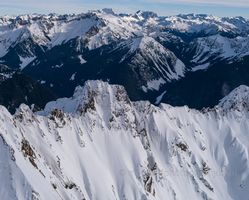 A striking aerial view of Snowking Mountain in Washington’s North Cascades, its steep snow-covered ridges and cliffs rising dramatically above the forested valleys of the Cascade River drainage. Captured with the Fuji GFX100S, this image reveals the rugged alpine beauty of the western North Cascades near Darrington, where winter light carves bold contrast across untouched slopes. A powerful fine art print for mountain lovers and collectors of Pacific Northwest landscapes.