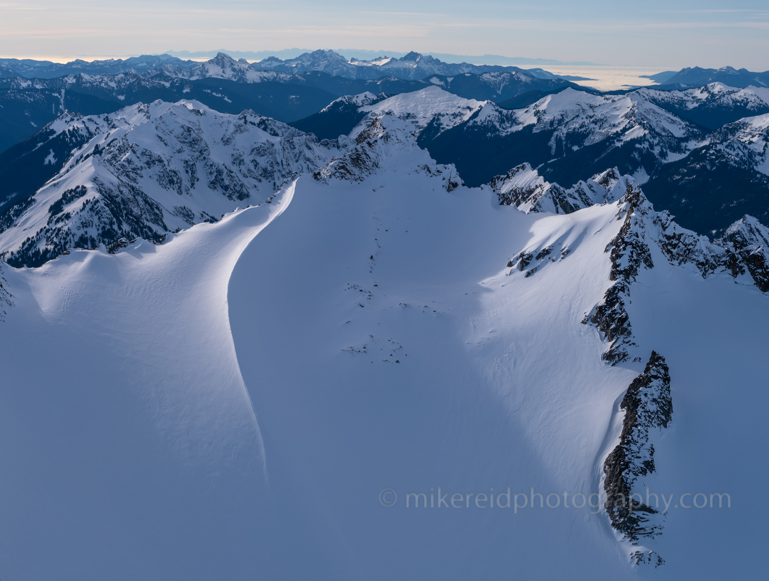 An aerial view of the Dana Glacier Basin framed by the rugged ridges between Dome Peak and Sinister Peak in Washington’s North Cascades. The smooth sweep of snow and ice curves gracefully across the frame, bordered by jagged rock spires and shadowed gullies that reveal the raw alpine drama of the Glacier Peak Wilderness. Captured from above in winter light, this image highlights the elegance and isolation of one of the Cascades’ most remote and glaciated regions — a fine art study in form, texture, and wilderness scale.