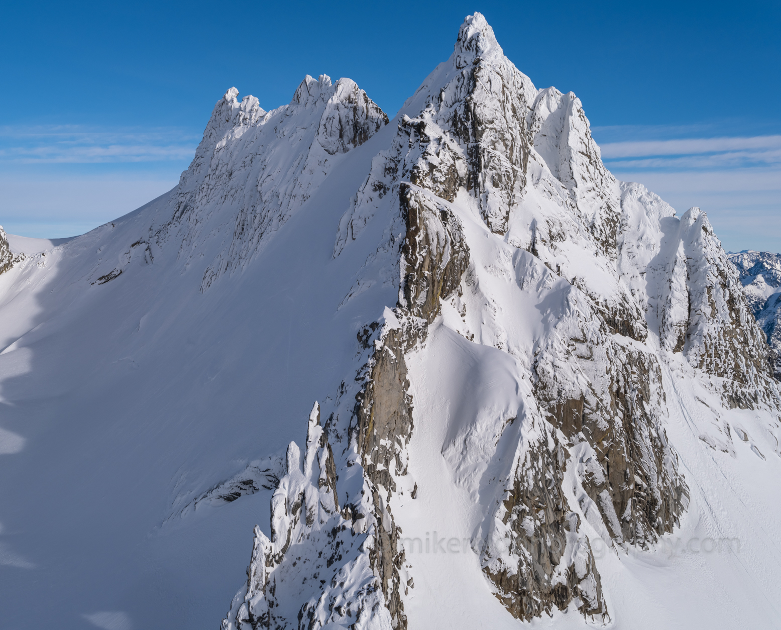 A dramatic aerial close-up of Snowking Mountain’s South Dome in Washington’s North Cascades. The sheer granite faces and snow-draped ridgelines reveal the power and precision of alpine geology sculpted by centuries of wind, ice, and time. Captured on a crisp winter day, this image highlights the bold vertical relief and deep textures that make the Snowking massif one of the North Cascades’ most striking summits. A stunning fine art print for mountain enthusiasts and collectors of Pacific Northwest wilderness imagery.