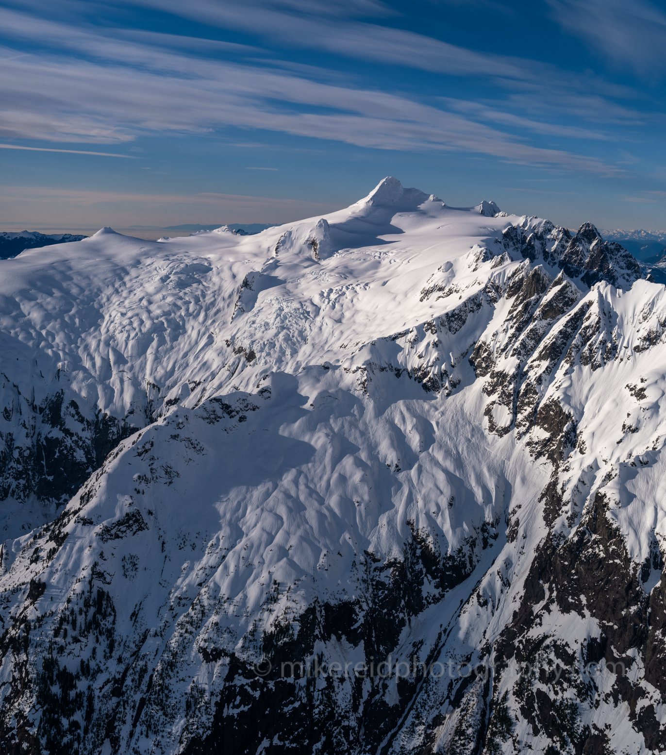 A breathtaking aerial view of Mount Shuksan’s Crystal and Sulphide Glaciers flowing down its western and southern flanks in Washington’s North Cascades. The photograph captures the mountain’s striking blend of smooth glacial curves and jagged rock ridges, sculpted by ice and time. From this vantage, the vast icefields shimmer under soft afternoon light, revealing the intricate patterns of crevasses and snow textures that define one of the most photographed peaks in the Pacific Northwest. A fine art aerial landscape celebrating Mount Shuksan’s iconic alpine form and timeless wilderness beauty.