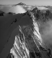 An elegant black and white aerial view of Spire Point and the ridges leading toward Glacier Peak captures the timeless drama of the North Cascades. Afternoon light glances across the snow and rock, sculpting bold contrasts and deep textures that reveal the mountain’s raw geometry. Without color, the interplay of light and shadow becomes the essence—pure alpine form and atmosphere. Captured with the Fuji GFX100S, this fine art image transforms Washington’s wilderness into a study of tone, texture, and strength.