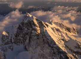 An aerial view of the rugged Black Buttes glowing under the soft golden light of sunset near Mount Baker. The sun’s final rays illuminate the serrated ridges and deep shadows of these volcanic remnants, creating a powerful interplay of light, texture, and atmosphere. Captured above the North Cascades, this fine art mountain photograph celebrates the dramatic beauty of the Pacific Northwest’s alpine wilderness in perfect evening light.