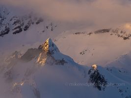 A single peak in the North Cascades catches the last golden light of sunset, glowing through a veil of drifting mist and alpine snow. The sharp summit rises like a beacon against the subdued pastel tones of the glacier beyond. Captured from the air with the Fuji GFX100S, this image reveals the fleeting warmth of day meeting the cold stillness of high mountain evening—a perfect union of light, shadow, and solitude in Washington’s rugged wilderness.