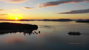 Beautiful 4K drone footage of a Washington State ferry approaching the Anacortes ferry dock at sunset. The golden light of evening reflects across the calm waters of the Salish Sea, with the San Juan Islands glowing on the horizon. This cinematic aerial view captures the tranquil beauty of Anacortes and the Pacific Northwest coast — perfect for fans of ferry travel, drone cinematography, and coastal sunsets.