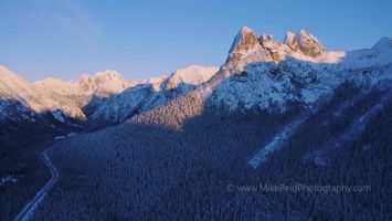 Spectacular 4K drone footage over Washington Pass and Liberty Bell Peak along Highway 20 in the North Cascades. Fresh snow blankets the rugged peaks and winding mountain road, glowing in soft winter light beneath a vivid alpine sky. This cinematic aerial view captures the dramatic beauty and remote serenity of one of Washington State’s most breathtaking mountain corridors — perfect for lovers of drone cinematography, winter landscapes, and Pacific Northwest wilderness.